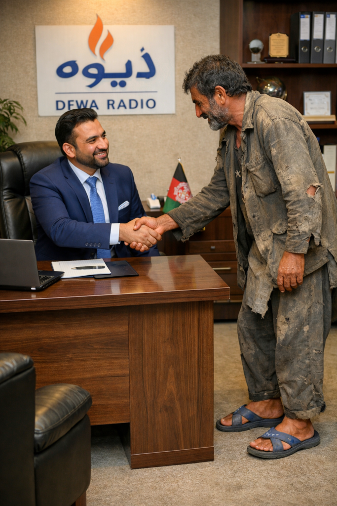 او دا يي هم ورته وويل: زۀ به د خپلوۍ له امله تاته دنده درکړم، تۀ هره ورځ زما موټر ساپي کوه، چې کله کومې جلسې ته تلم بوټونه مې رنګوه او فقط دا دما د مخې ميز دې که کله راتهساپي کړ ، زۀ به درته مياشتينی معاش له خپله جيبه درکوم، چې هغه د اولادونو د اوبال ده،