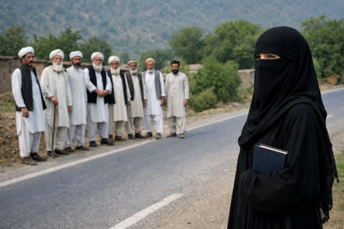 چې دې وخت کې يوه نجلۍ هم رامعلومه شوه، تور اوږد حجاب يي پر ځان وۀ ، د حجاب پر سر يي د ژمي جمپر هم اغوستی وه، لۀ تور لوی ټيکری څخه يي يوازې دوې سترګې يي ښکاريدې،نور يي ټول مخ پټ وۀ،